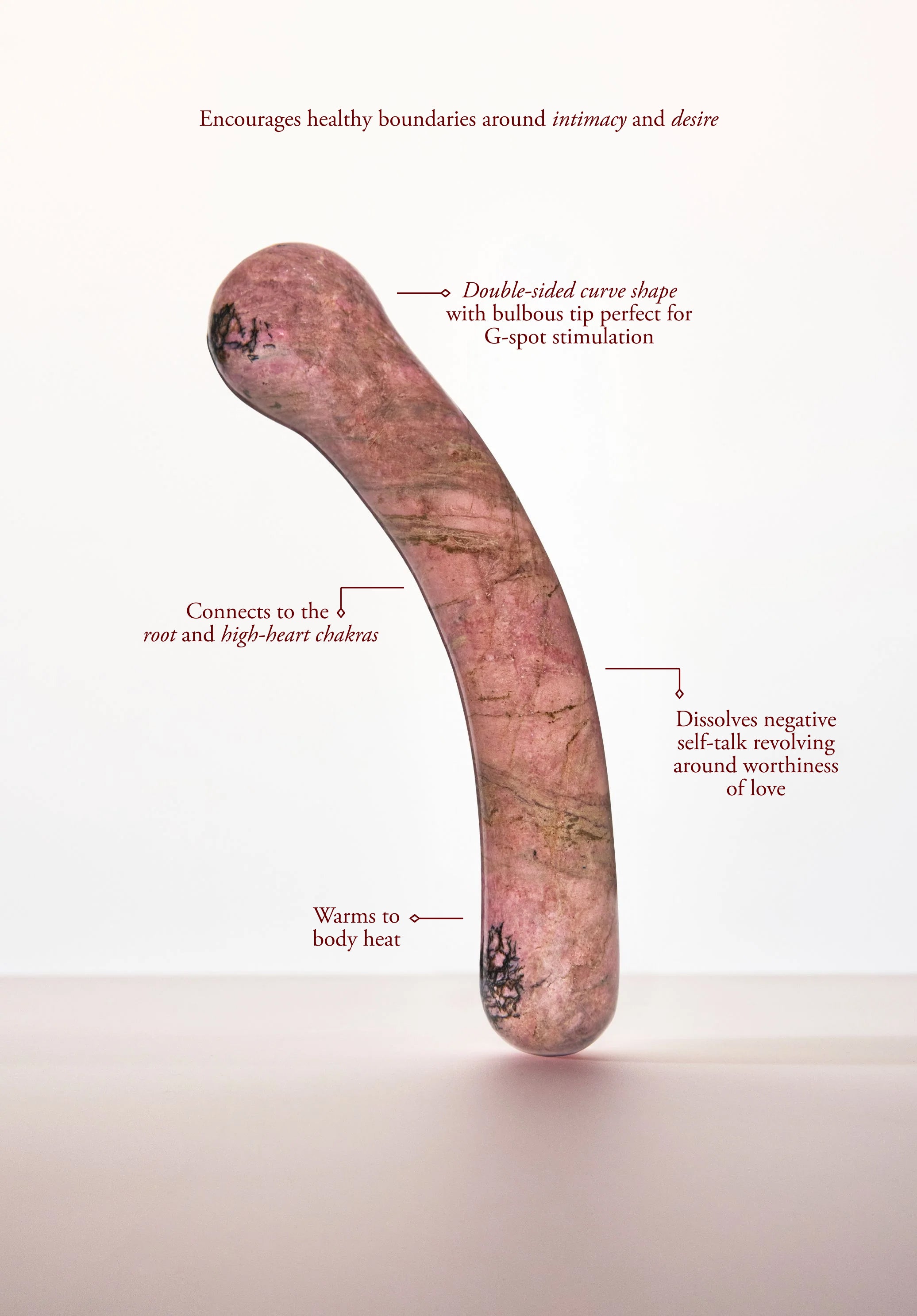 The Anahata Curve is made from pure rhodonite crystal. Rhodonite balances the emotional body while encouraging connection and love. It activates and stimulates the heart chakra, allowing emotional wounds to be processed and cleared. It protects against tendencies of self-destruction, codependency, and abuse. Rhodonite provides grounding while balancing yin and yang energies. This is a supportive stone that helps one achieve their highest potential.
