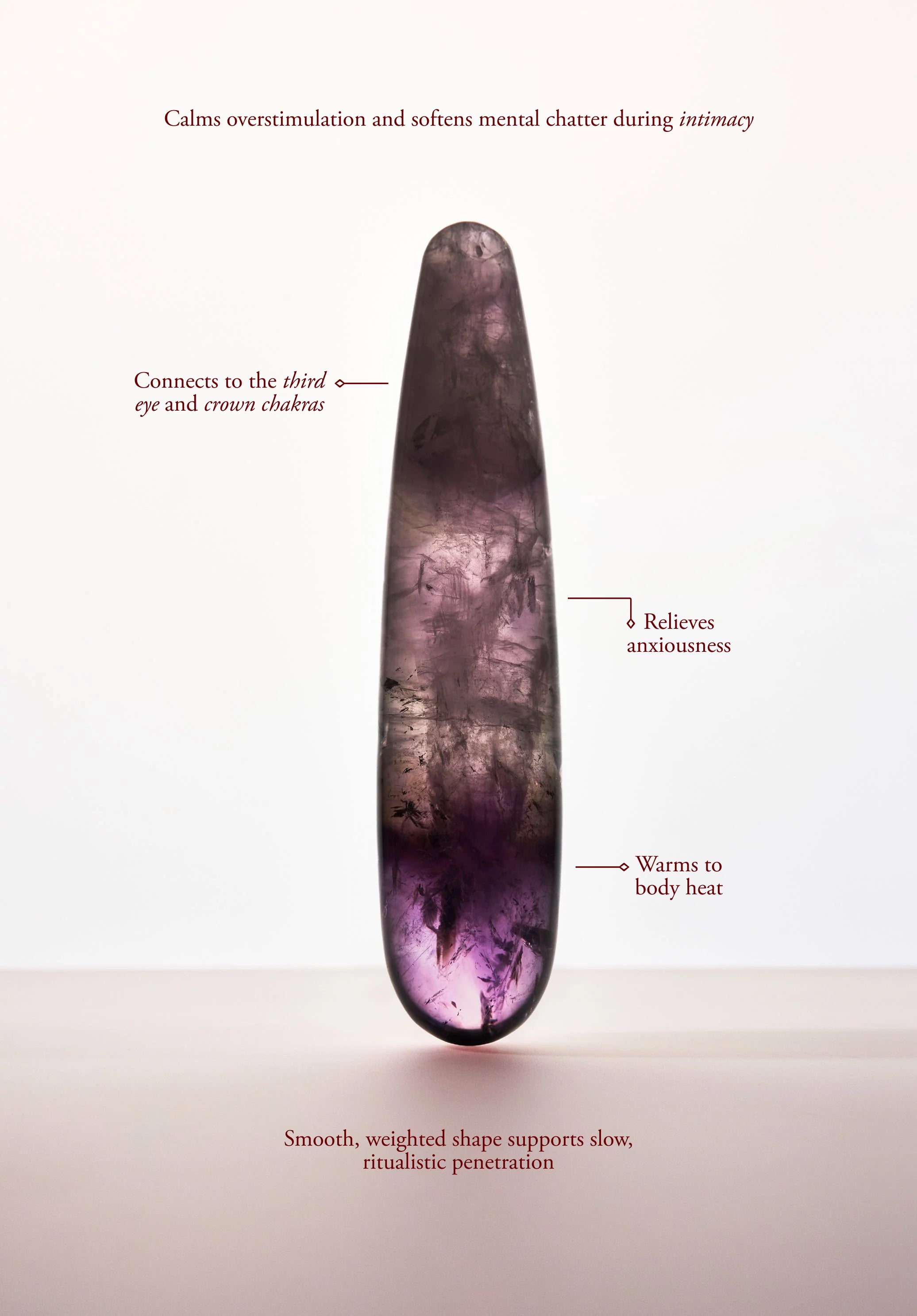 The Amethyst Original is made from pure amethyst, a meditative and calming stone which works on the emotional, spiritual, and physical planes to restore calm, balance, patience, and peace. Amethyst was once used by the Ancient Greeks as a drinking gourd because it was believed to promote sobriety. It remains a useful tool for clarity of mind and identifying and releasing negative patterns or behaviors. Amethyst contains soothing energies that promote peacefulness and contentment and are ideal for achieving a meditative state. Its gentle aura can also assist in healing from grief or personal loss.